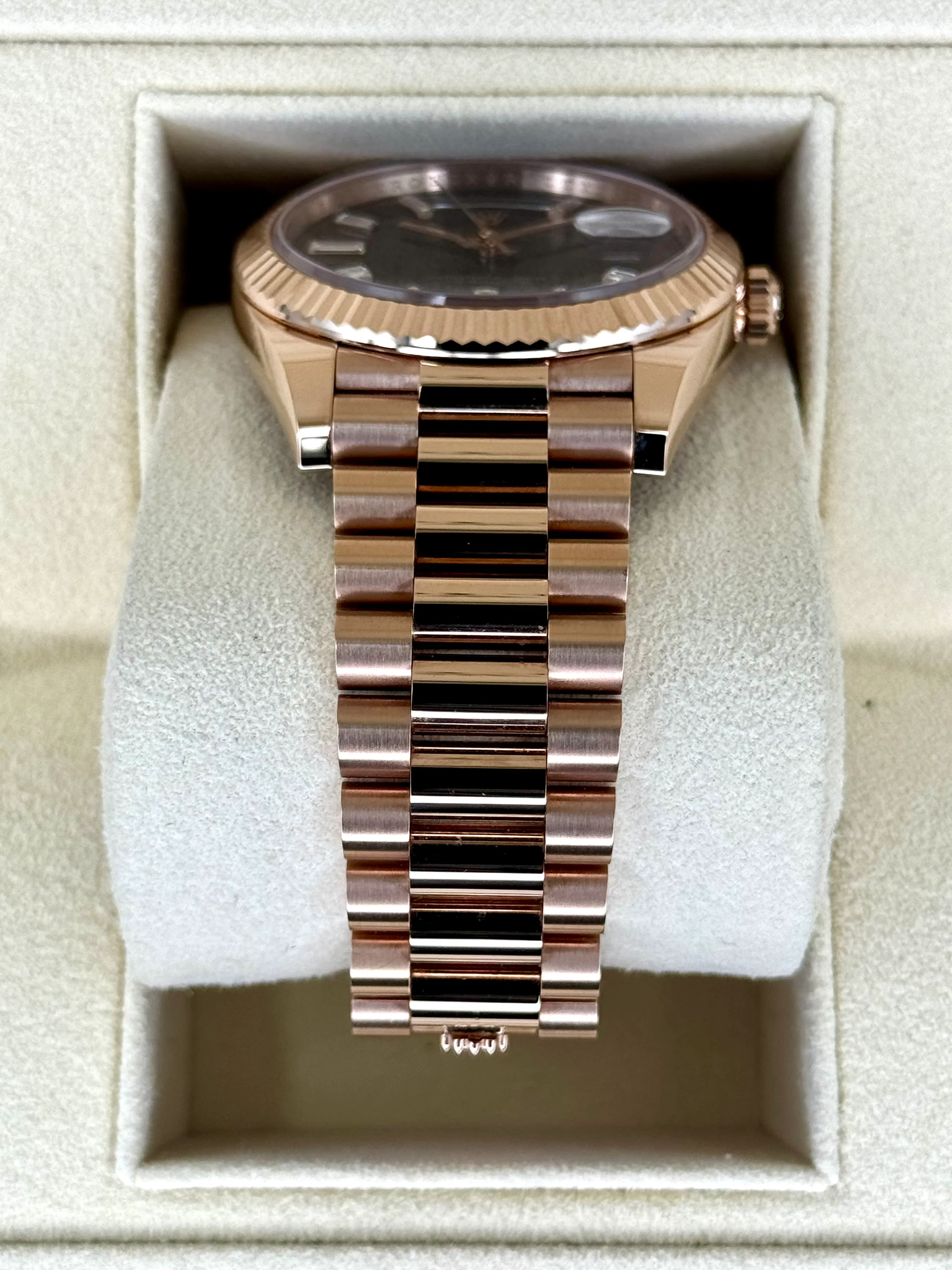 NEW 2025 Rolex Day-Date 40mm 228235 18k Rose Gold Presidential Bracelet Chocolate Diamond Baguette Dial